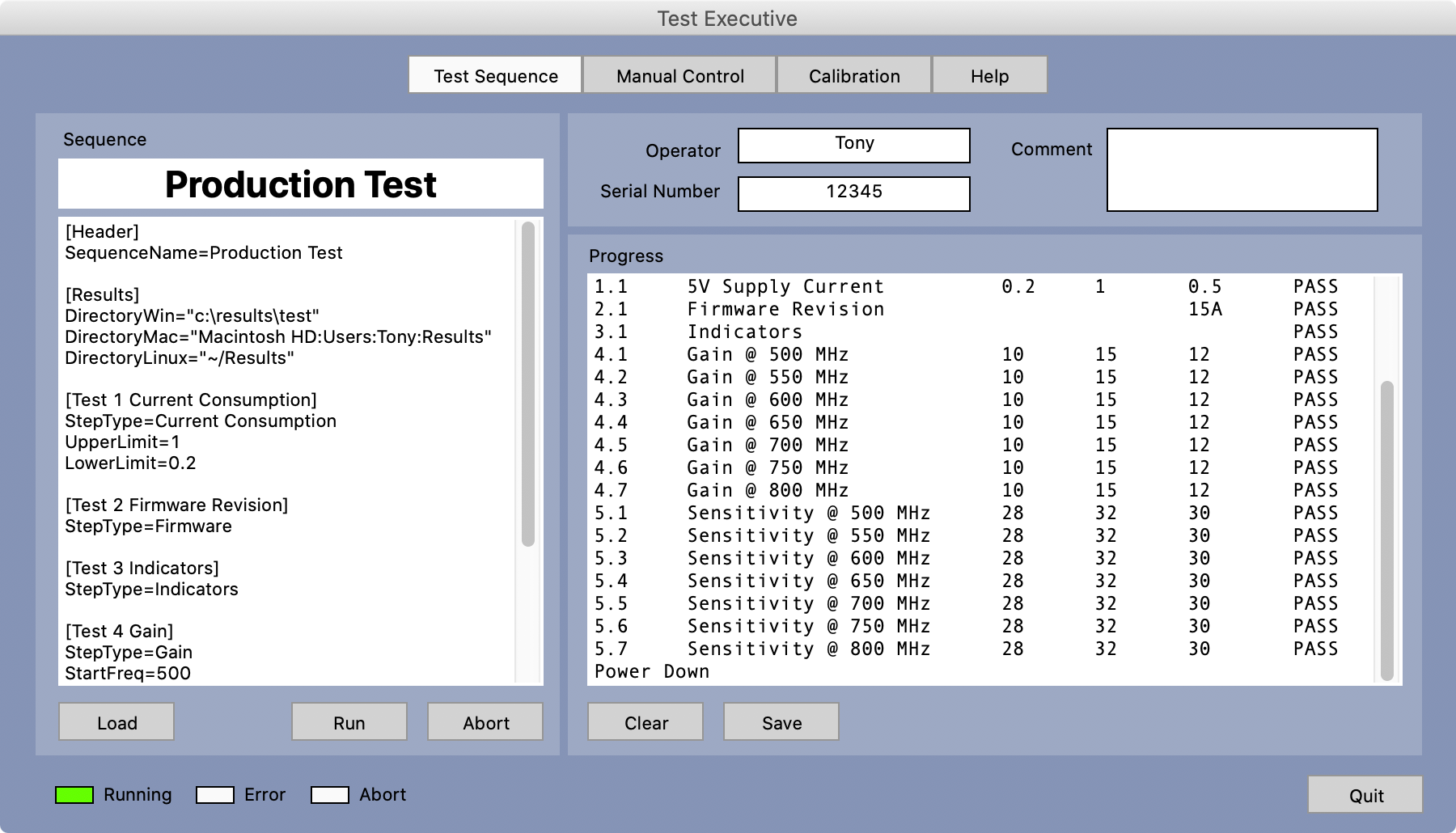 The test sequence is defined in a sequence file, similar to a config/ini file, created using any standard text editor. An example is shown below: